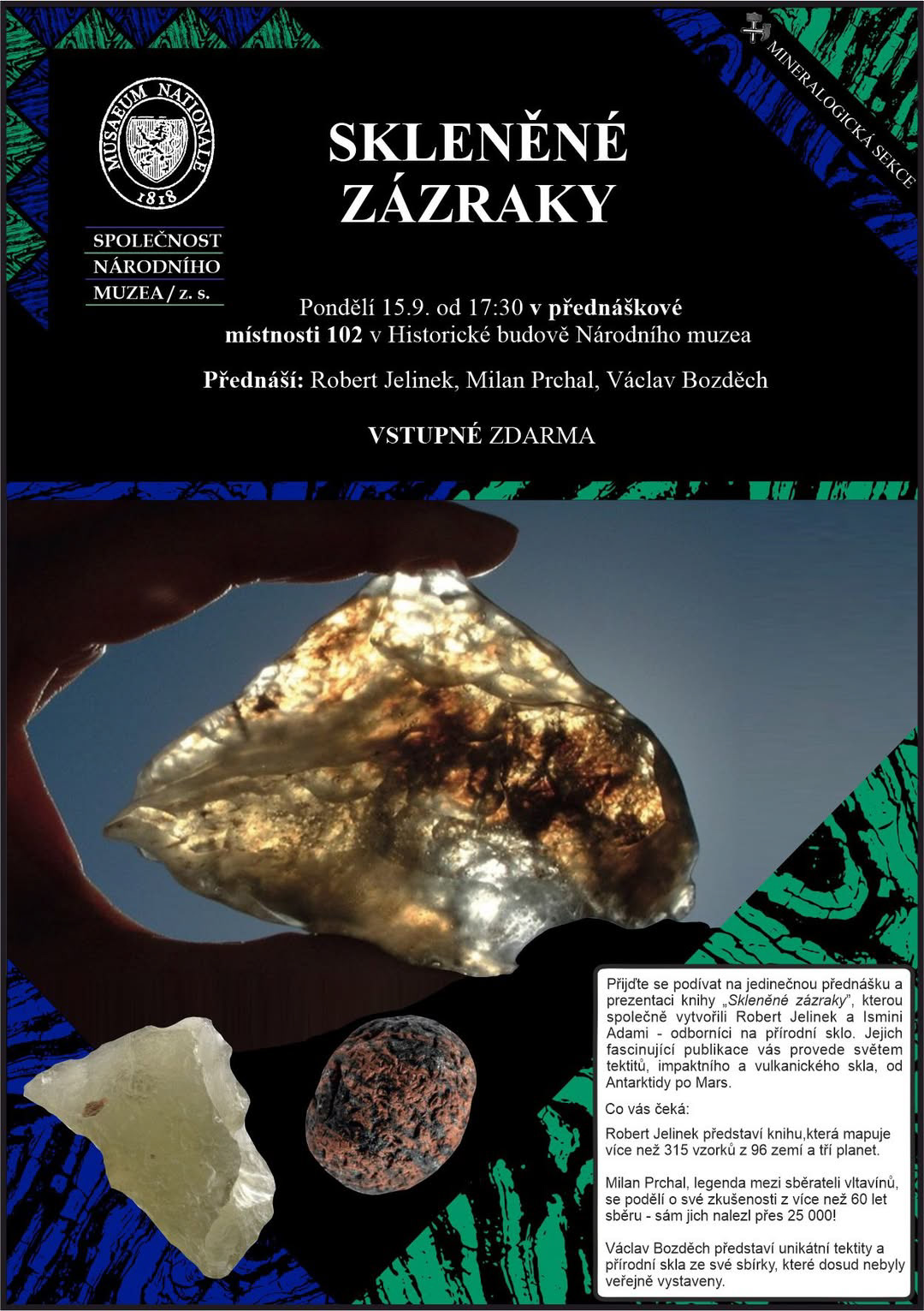 We also presented exquisite moldavite and other natural glass specimens from private collections at the Moravian Museum, complemented by an excellent lecture on volcanic glass by Lukáš Krmíček.